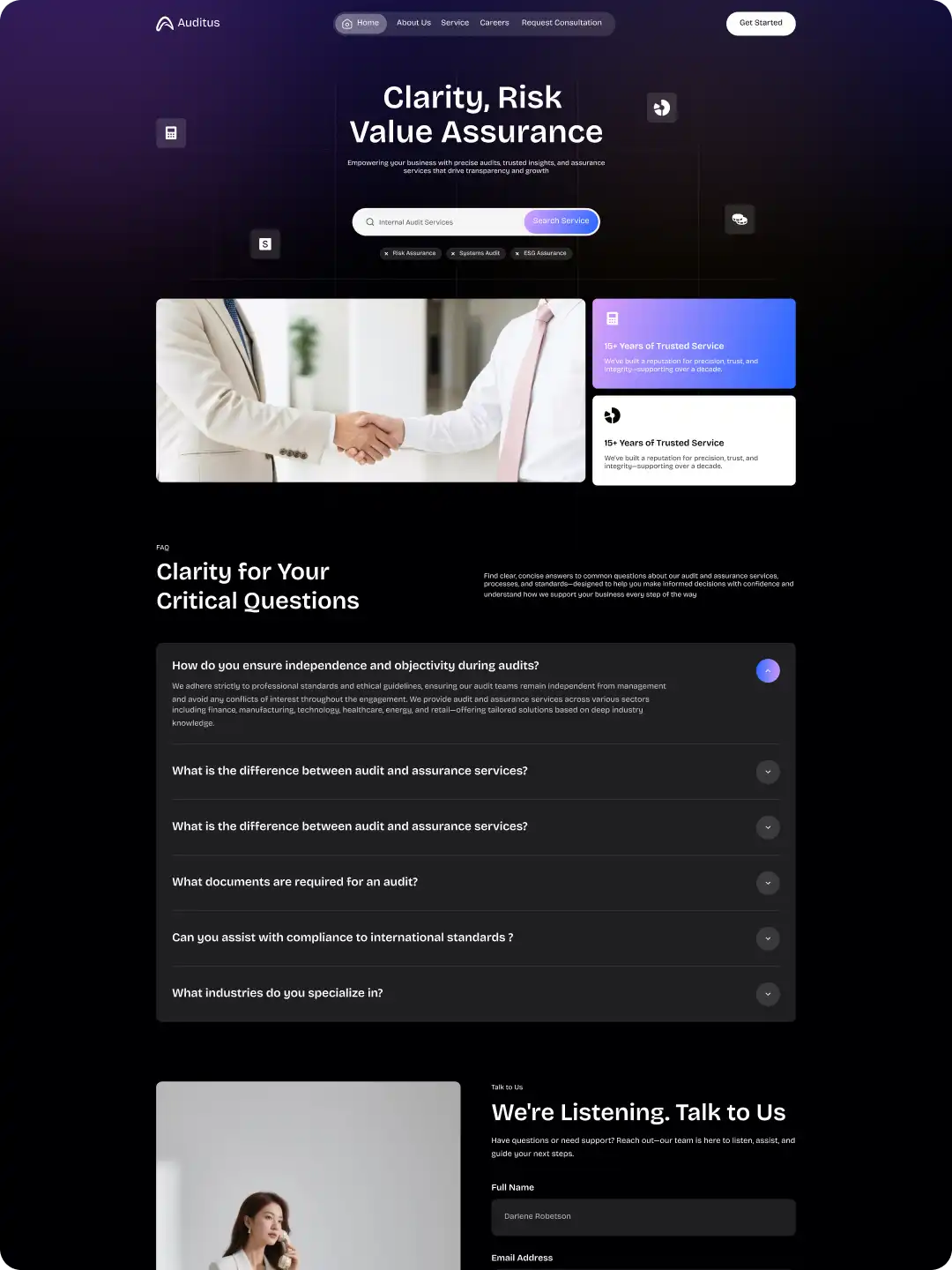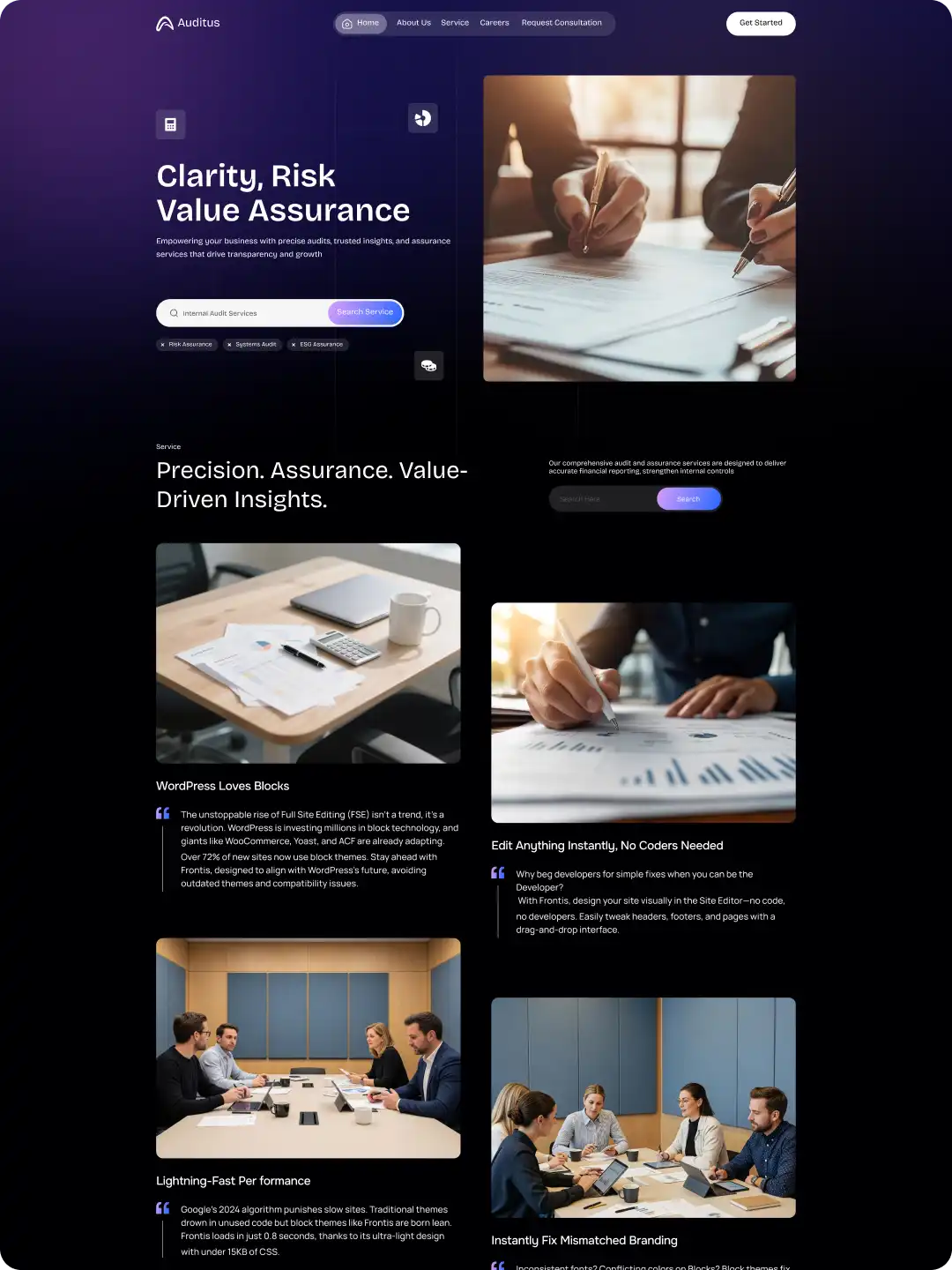 Auditus is a modern WordPress template for audit & assurance firms. Launch service pages, team bios, credentials, and lead forms with Gutenberg-native blocks optimized for speed, trust, and SEO.